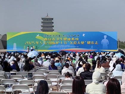 “關(guān)愛(ài)護士隊伍·守護人民健康” 主題健步走活動(dòng)在世博園舉行發(fā)表于:2026-01-16 瀏覽34次為慶祝第114個(gè)國際護士節,弘揚新時(shí)代護理職業(yè)精神,5月7日上午,由西安市衛生健康委、西安醫學(xué)會(huì )主辦,西安市第三醫院、西安市紅會(huì )醫院、西安市中醫醫院承辦的“關(guān)愛(ài)護士隊伍,守護人民健康”主題健步走活動(dòng)在西安世博園隆重舉行。全市醫療衛生系統1500余名護理工作者代表參加活動(dòng)。